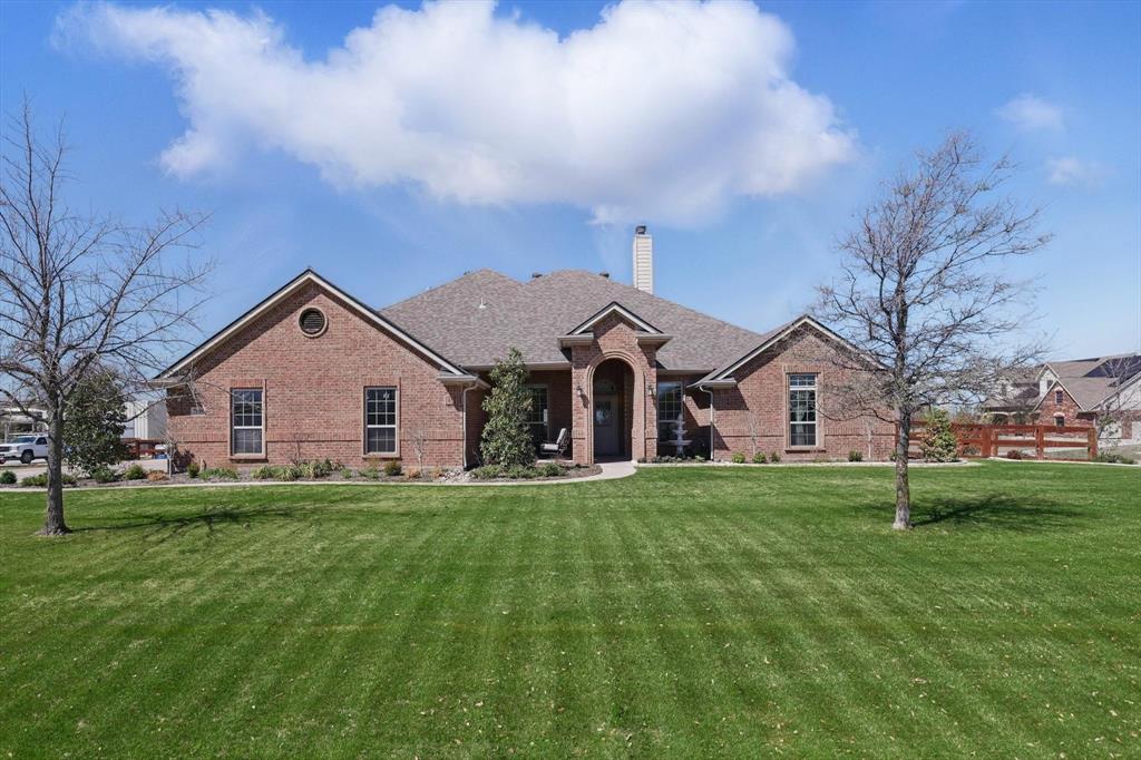 Welcome to this breathtaking 1-story home, nestled on a 1-acre corner lot, where you can enjoy stunning Texas sunsets from the large covered back patio. As you step through the front door, you’re greeted by a striking barrel ceiling and elegant arches that set the tone for this beautifully designed home.The bedroom off the foyer, complete with custom double barn doors, would make a perfect study. The spacious living room centers around a charming wood-burning fireplace, which is not only a focal point but also efficiently heats the living space and bedrooms through built-in blowers. The open kitchen is an entertainer’s dream, featuring marble countertops, an eat-in bar, a large island, stainless steel appliances, double ovens, a glass cooktop, and a walk-in pantry. Enjoy meals with family and friends in the cozy breakfast area, all while overlooking the peaceful view outside.